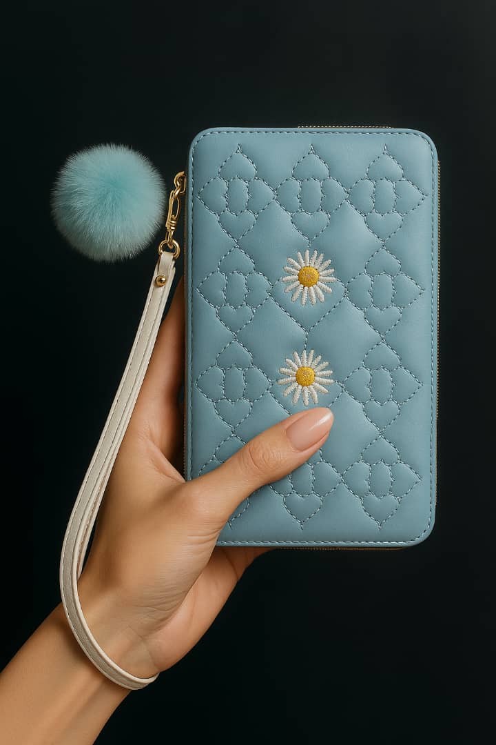 با فشار دادن دکمه فشاری بر روی لبه کیف، فریمها باز میشوند و میتوان به داخل کیف دسترسی داشت. داخل کیف یک فضا مخصوص قرار دادن موبایل است که یک چسبانک یا نگهدارنده موبایل دارد تا موبایل به آن بچسبد و در داخل کیف جابجا نشود. در یک طرف 2 جیب جاکارتی و یک جا عکس و در طرف دیگر نیز 3 جیب جاکارتی دارد. ضمنا یک جیب زیپدار برای قرار دادن وسایل کوچک و ریز و یک فضای مخصوص اسکناس دارد. داخل کیف یک حلقه کوچک دارد که قلاب بند مچی یا دستی به آن متصل میشود.و همچنین یک آویز پم پم زیبا و رنگی جهت جا سوئیچی